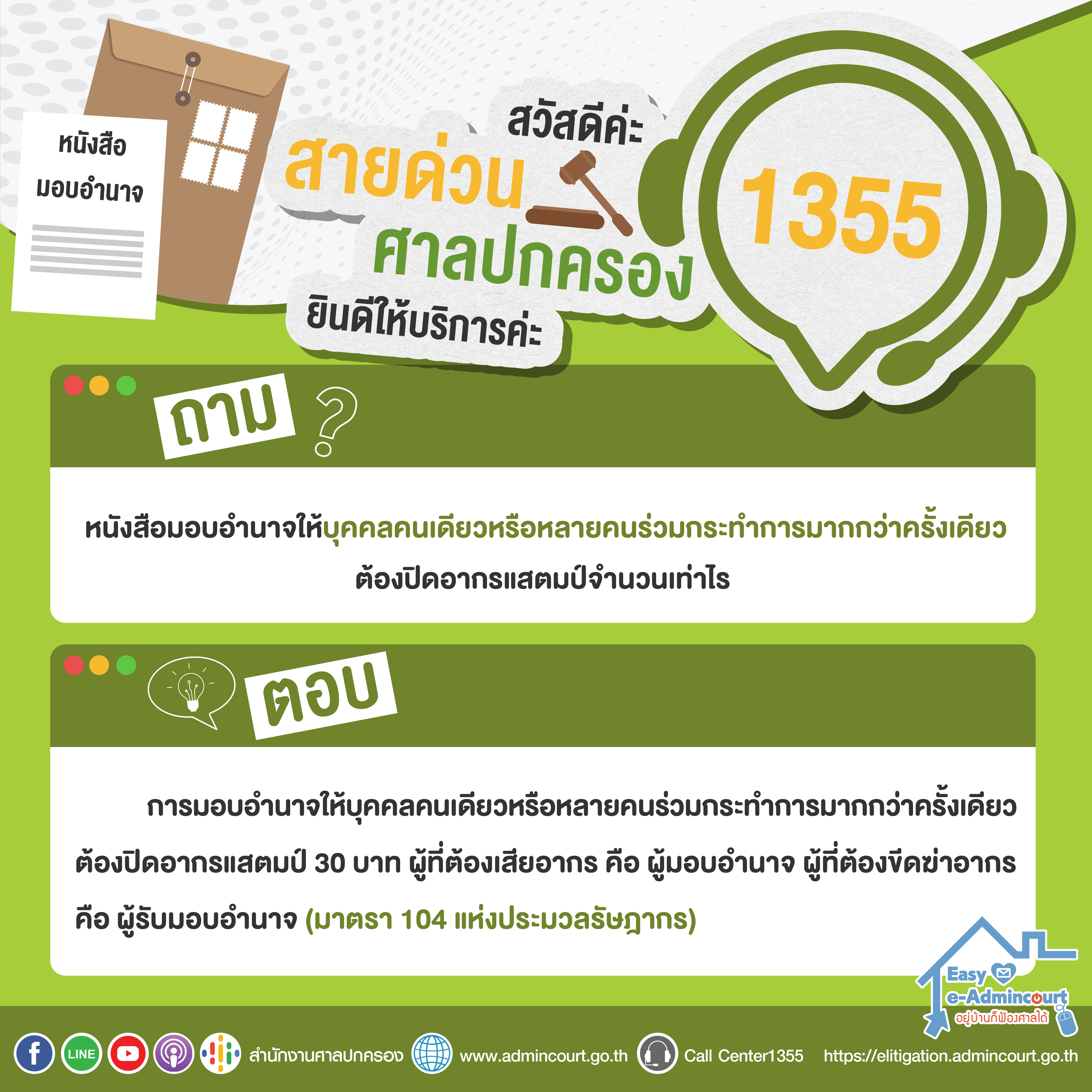 Infographic FAQ สายด่วน 1355 ตอนที่ 35 หนังสือมอบอำนาจให้บุคคลคนเดียวหรือหลายคนร่วมกระทำการมากกว่าครั้งเดียว ต้องปิดอากรแสตมป์จำนวนเท่าไหร่