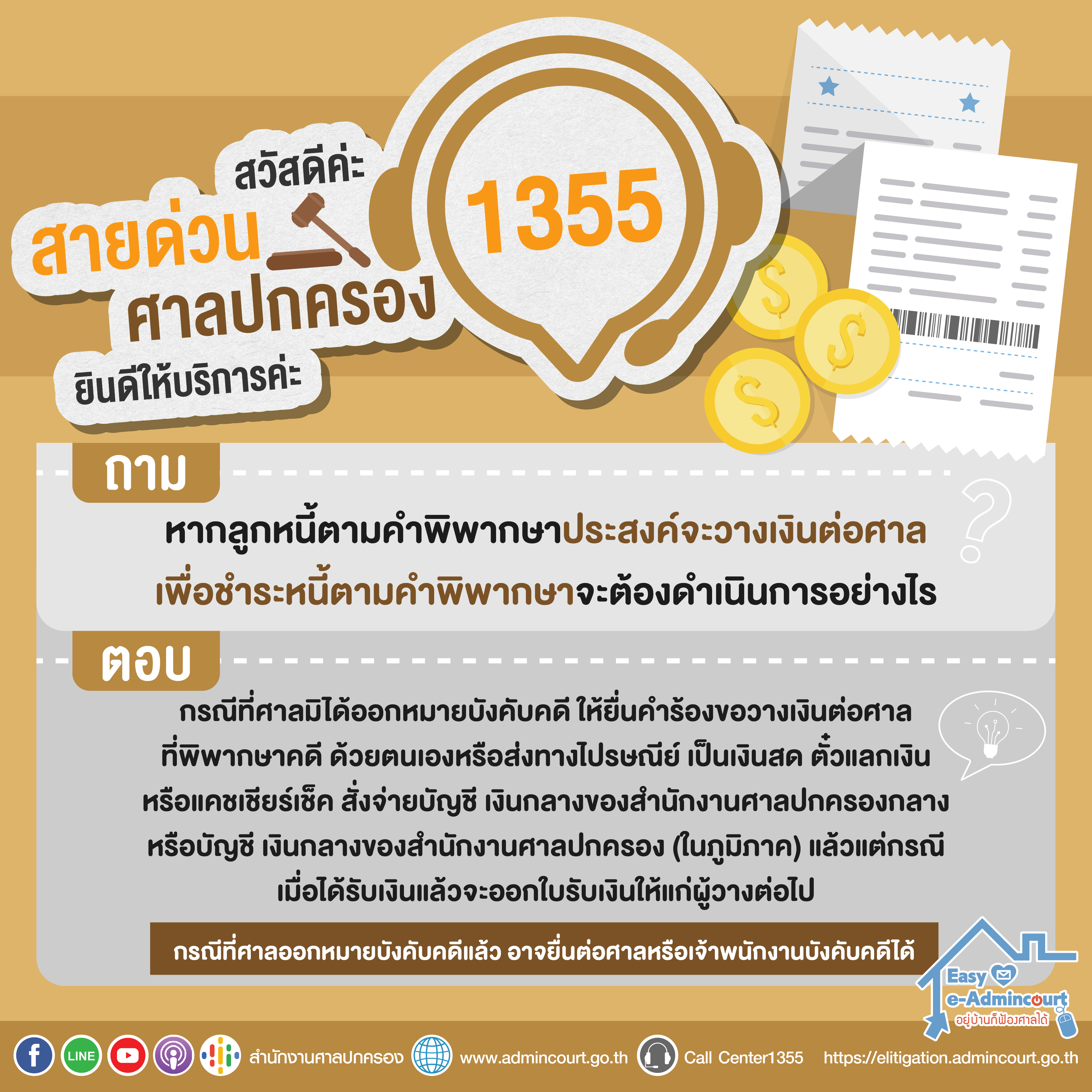 Infographic FAQ สายด่วน 1355 ตอนที่ 72 หากลูกหนี้ตามคำพิพากษาประสงค์จะวางเงินต่อศาล เพื่อชำระหนี้ตามคำพิพากษาจะต้องดำเนินการอย่างไร