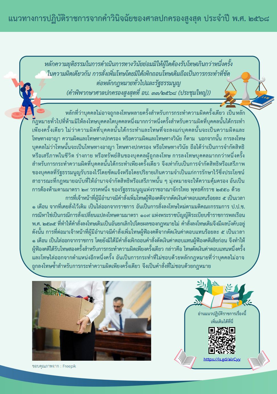 หลักความยุติธรรมในการดำเนินการทางวินัยย่อมมิให้ผู้ใดต้องรับโทษเกินกว่าหนึ่งครั้งในความผิดเดียวกัน การสั่งเพิ่มโทษโดยมิได้เพิกถอนโทษเดิมถือเป็นการกระทำที่ขัดต่อหลักกฎหมายทั่วไปและรัฐธรรมนูญ