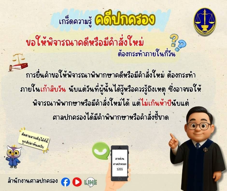 Infographic เกร็ดความรู้คดีปกครอง Ep.22 ขอให้พิจารณาคดีหรือมีคำสั่งใหม่ ต้องกระทำภายในกี่วัน