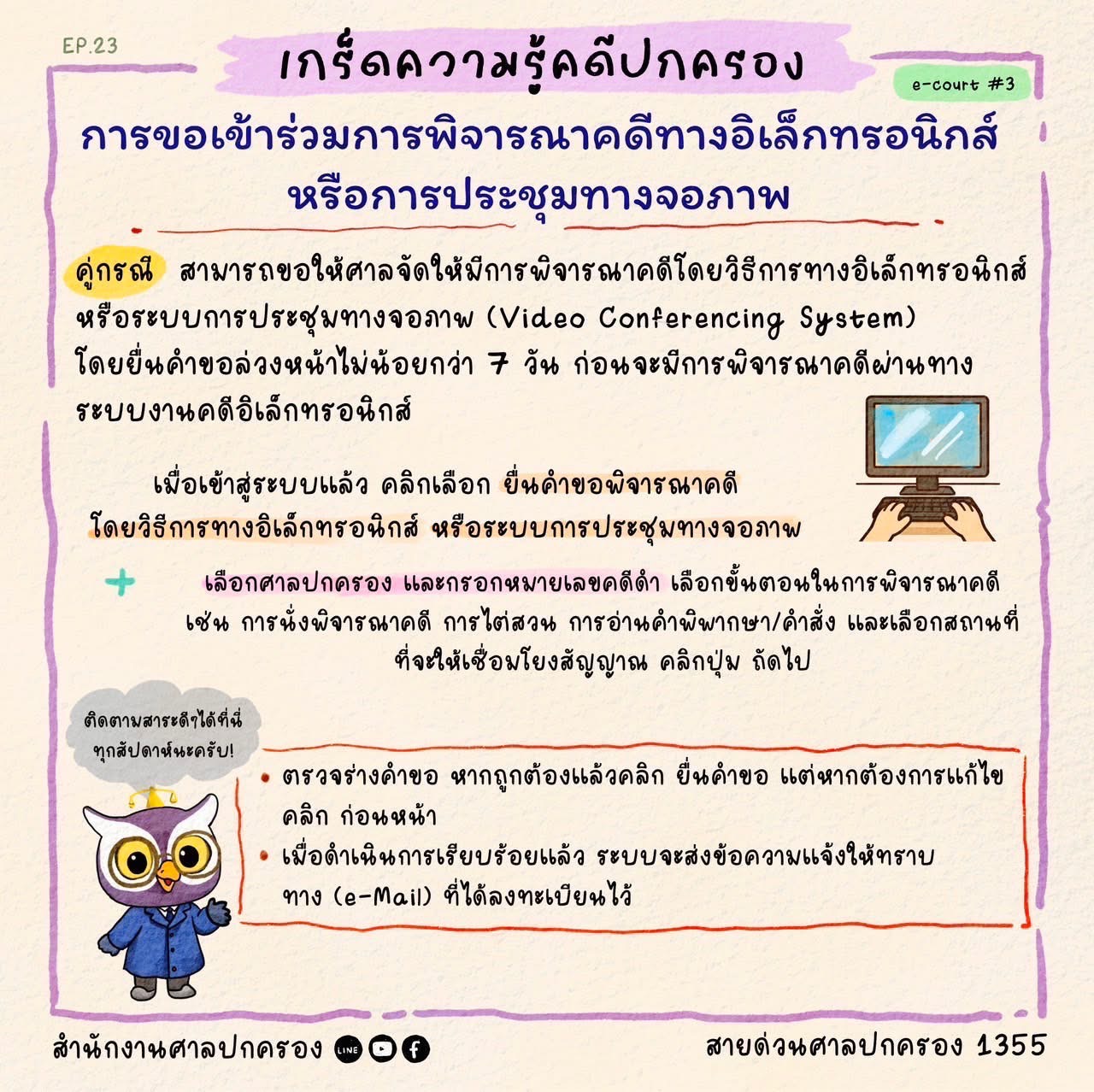 Infographic เกร็ดความรู้คดีปกครอง Ep.23 การขอเข้าร่วมการพิจารณาคดีทางอิเล็กทรอนิกส์ หรือการประชุมทางจอภาพ