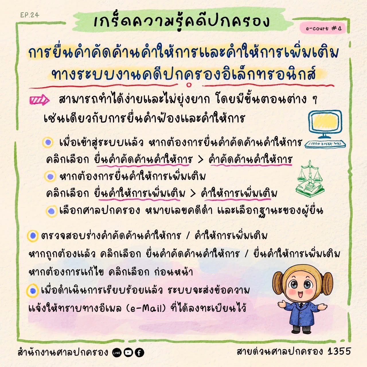 Infographic เกร็ดความรู้คดีปกครอง Ep.24 การยื่นคำคัดค้านให้การและคำให้การเพิ่มเติมทางระบบงานคดีปกครองอิเล็กทรอนิกส์