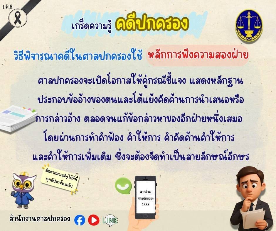 Infographic เกร็ดความรู้คดีปกครอง Ep.8 วิธีพิจารณาคดีในศาลปกครองใช้หลักการฟังความสองฝ่าย